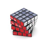 A large 4x4 Rubik's Cube personalised with full colour artwork on all 6 faces. Each face has 16 glossy square stickers on which the artwork is digitally printed.